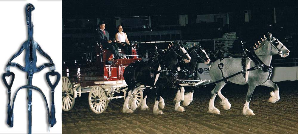 Nothing is in stock here at Shanahan Harness. Each part is made especially for you, our client, upon order to ensure that every piece is a custom piece. If you have an idea in mind, we can make it happen for you in our shop. We can incorporate your own style as well as your farm or business logo into our work. Quality individual castings as well as different colors of leather to trim your harness help to make your harness unique only to you. Pictured on this page are a few of the custom harnesses we have made over the years.